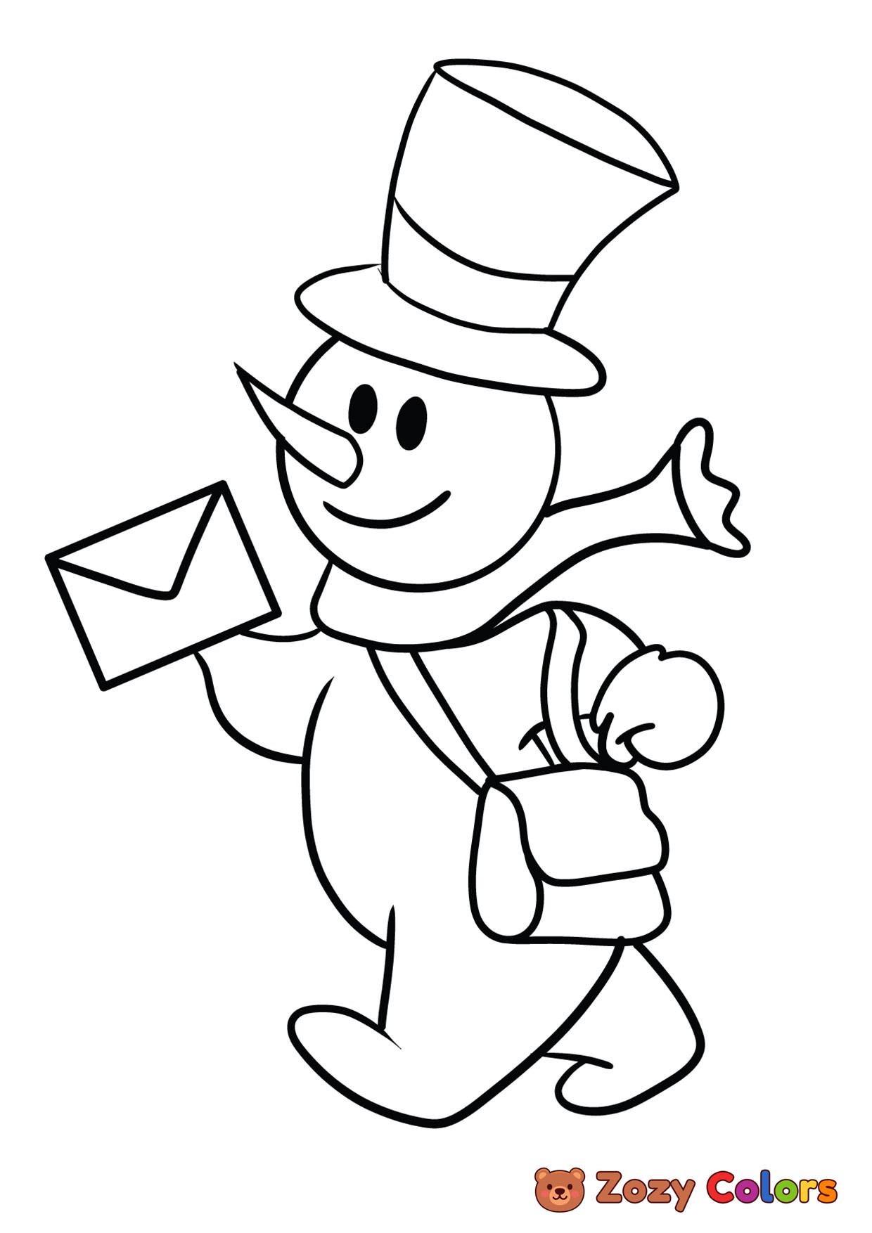 Snowman bringing mail. Coloring page to print or download and color for your kids.