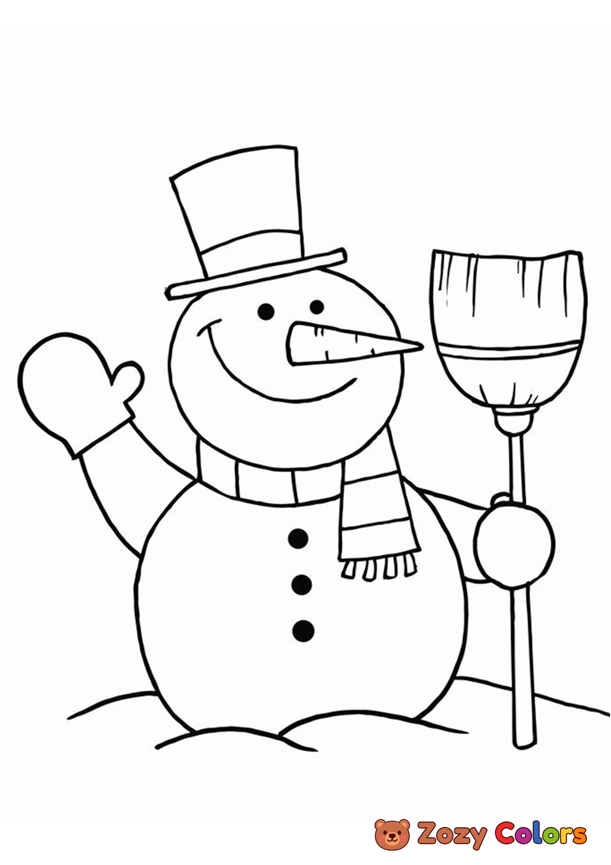Snowman with a broom. Coloring page to print or download and color for your kids.