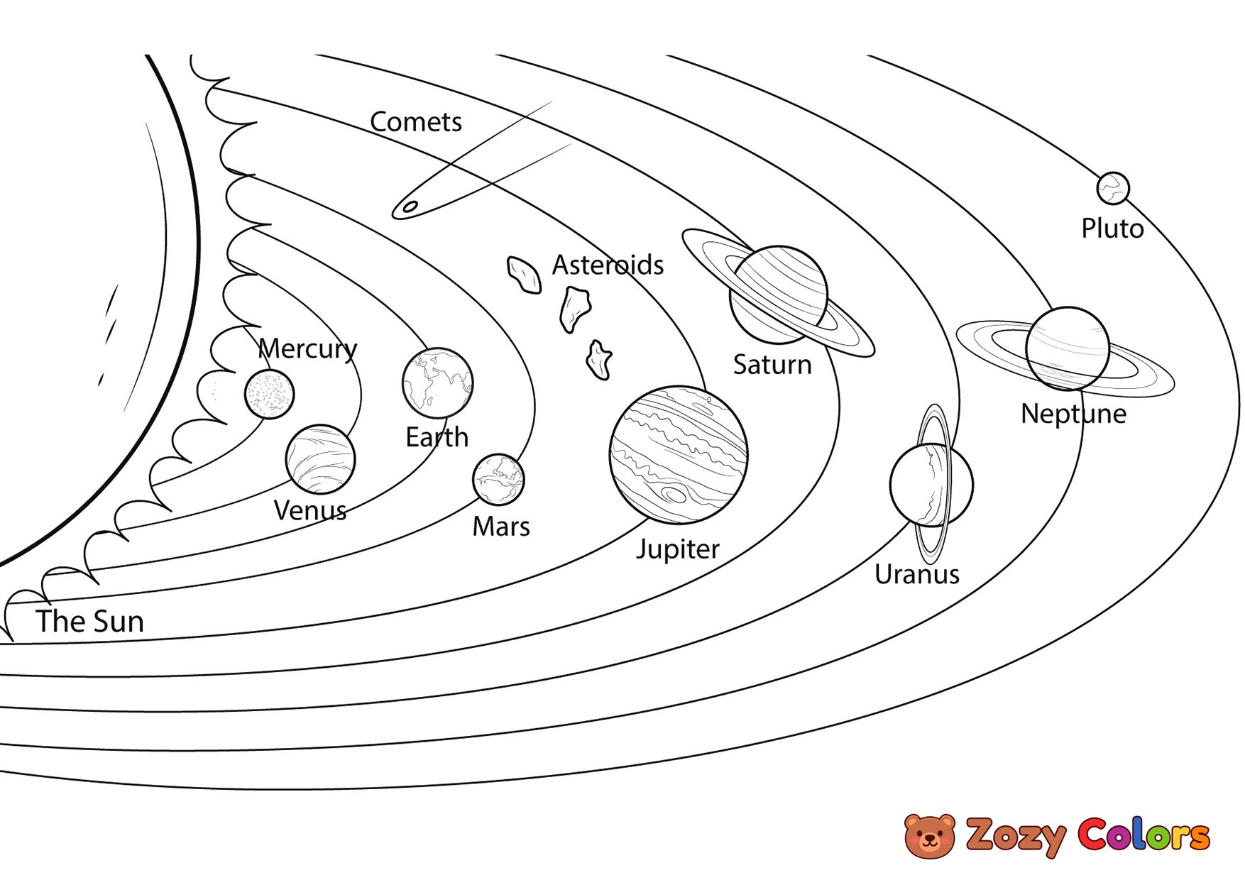 Solar system model. Coloring page to print or download and color for your kids.