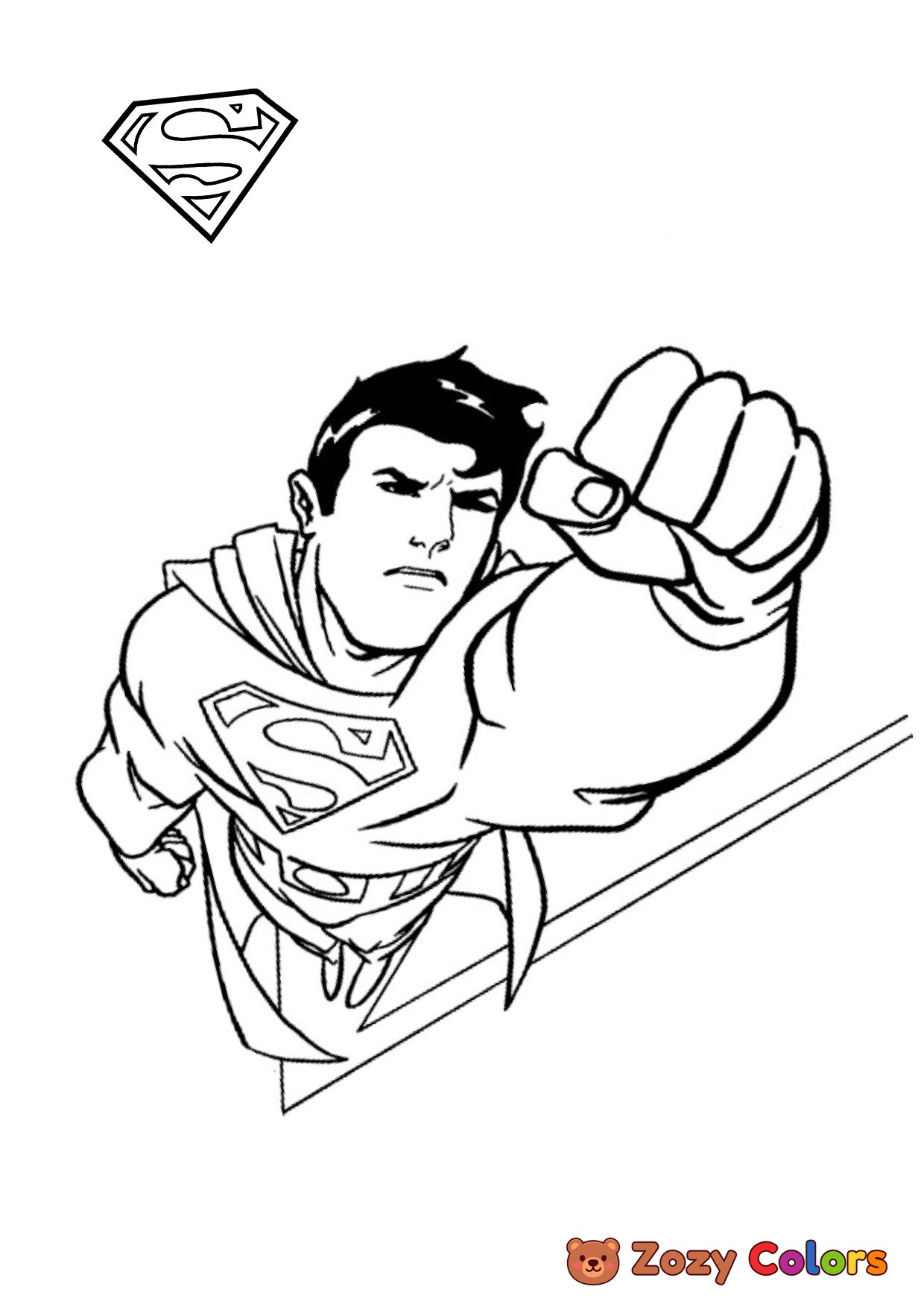 Superman flying with a fist. Coloring page to print or download and color for your kids.