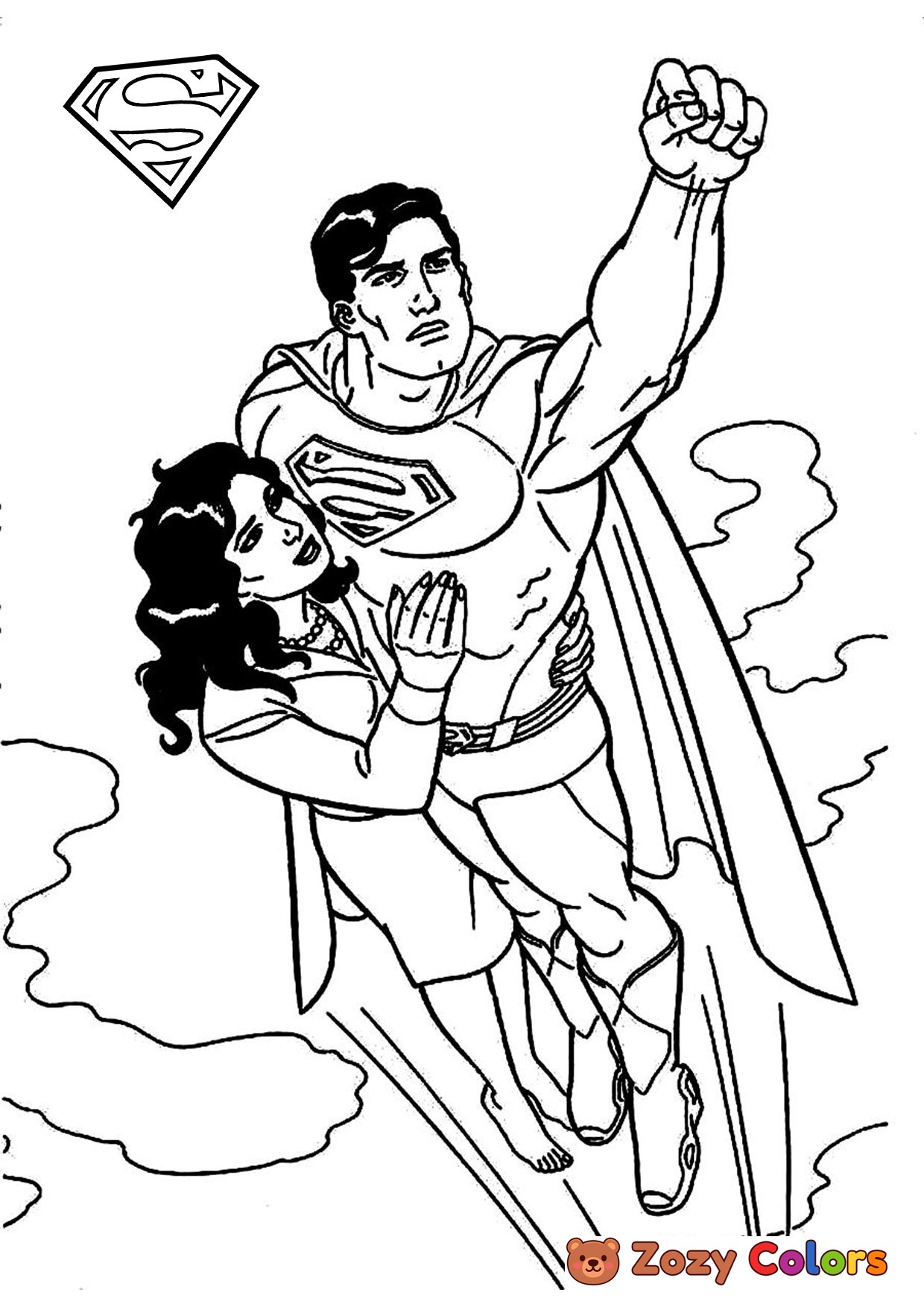 Superman flying with Lois. Coloring page to print or download and color for your kids.