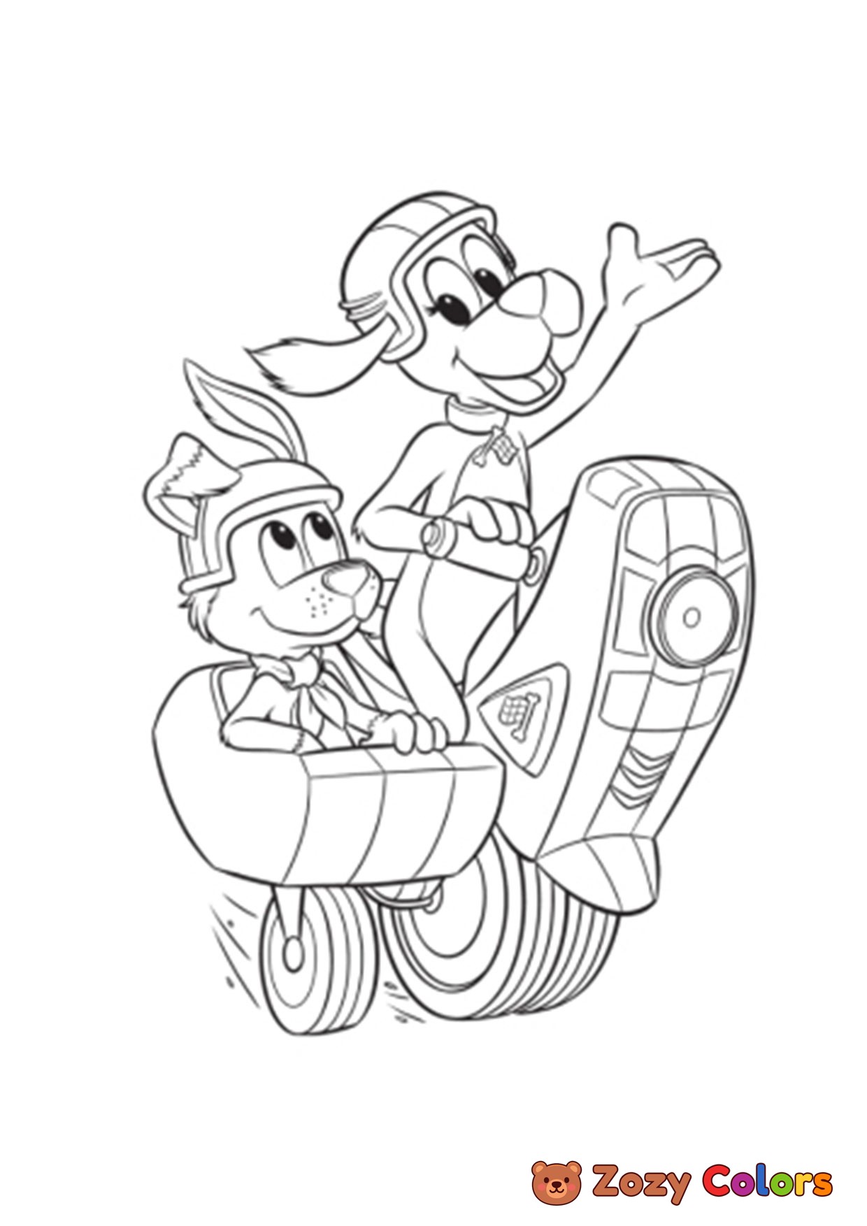 Tag and Scooch riding. Coloring page to print or download and color for your kids.
