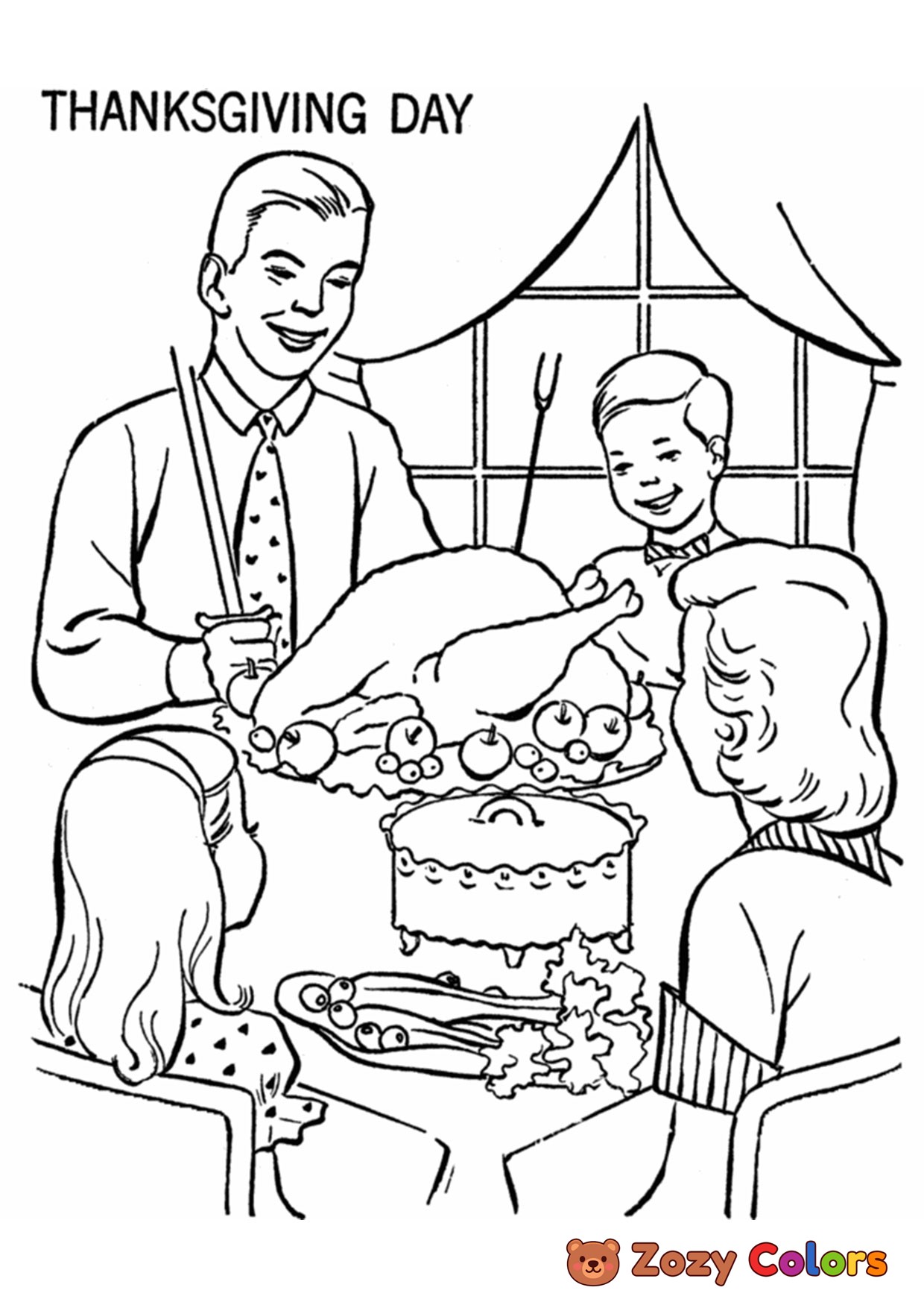Thanksgiving day family dinner. Coloring page to print or download and color for your kids.