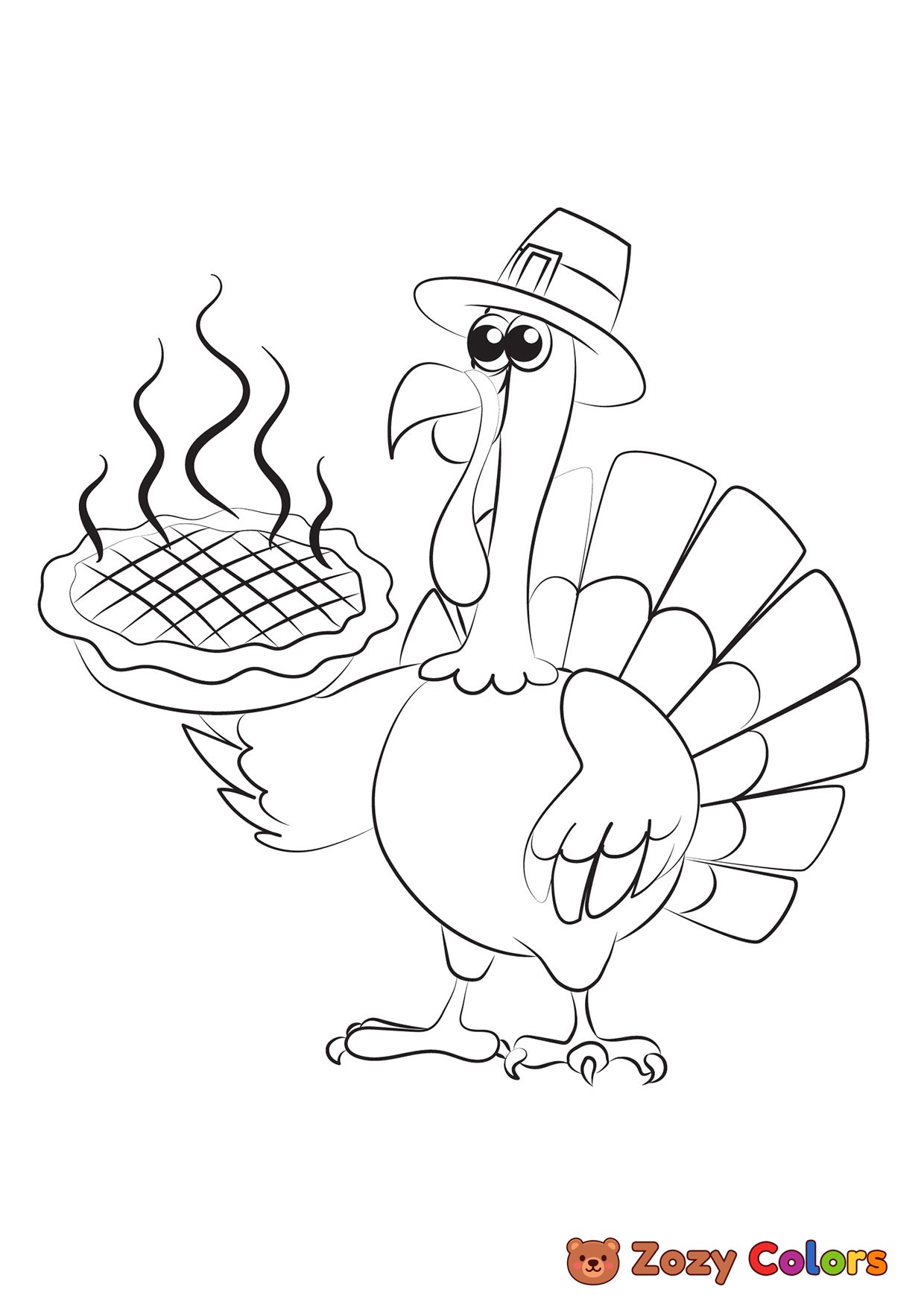 Thanksgiving turkey with a pie. Coloring page to print or download and color for your kids.