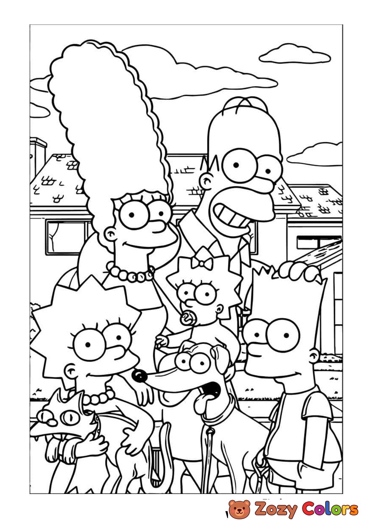 The Simpsons Family with the family dog and cat. Coloring page to print or download and color.
