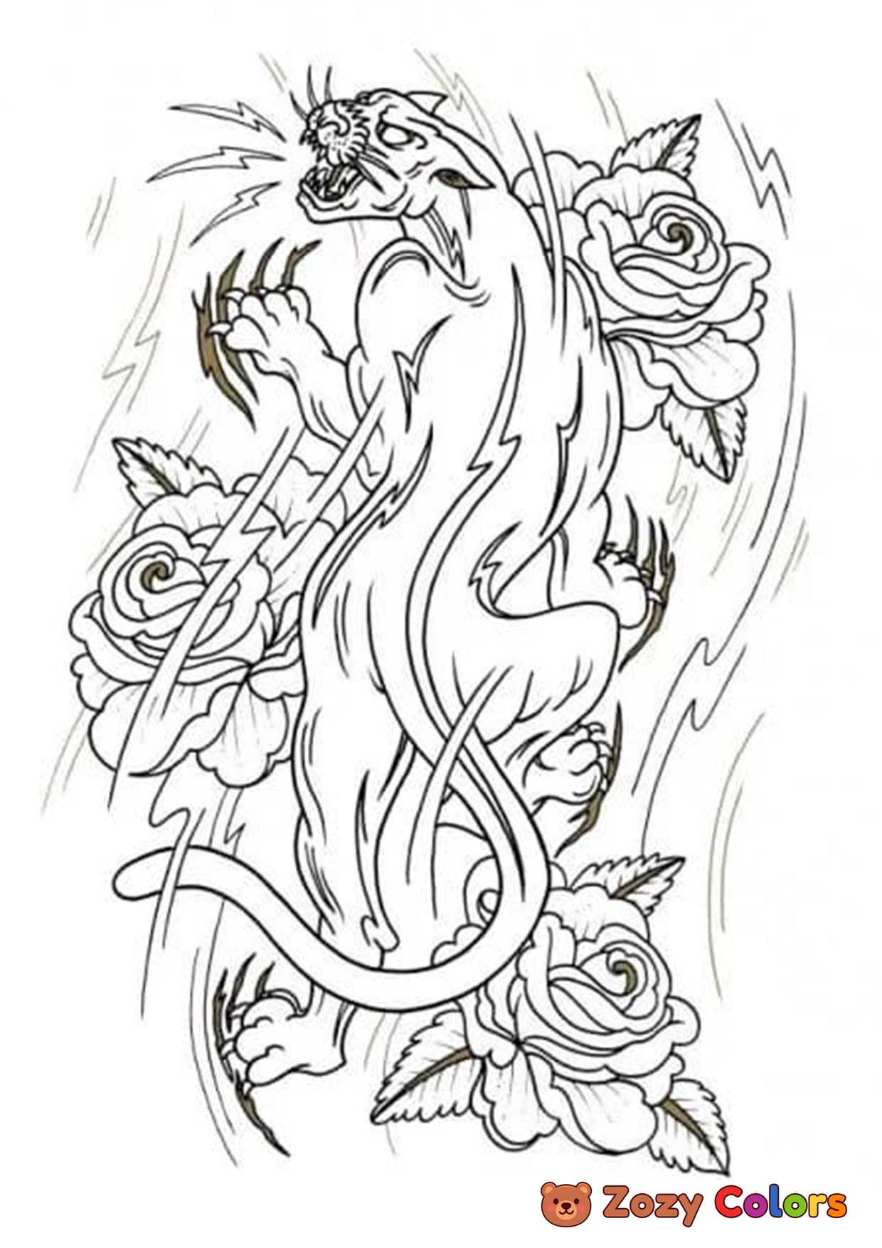 Tiger and roses. Free adult printable coloring page, pdf's and sheets.