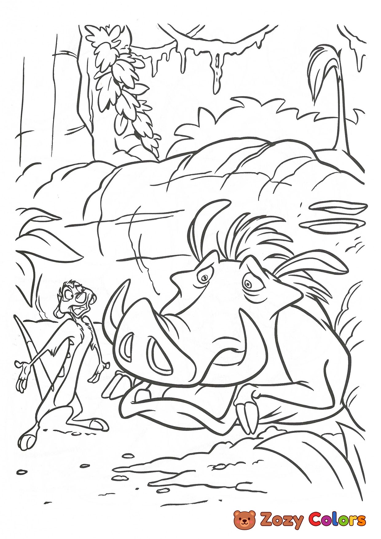 Timon helping Pumba Lion King. Coloring page to print or download and color for your kids.