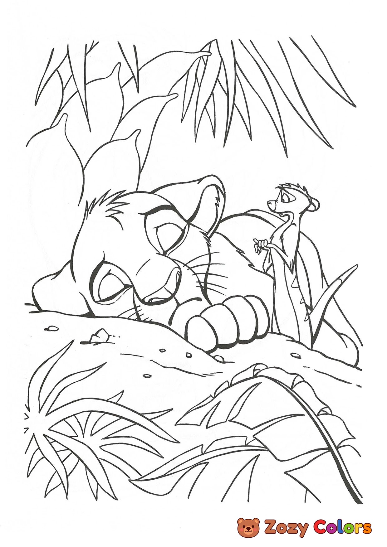 Timon saving exhausted Simba. Coloring page to print or download and color for your kids.