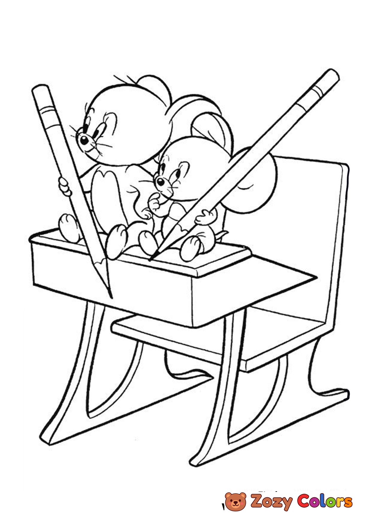Tom and Jerry and Nibbles, learning in school. Coloring page to print or download and color.