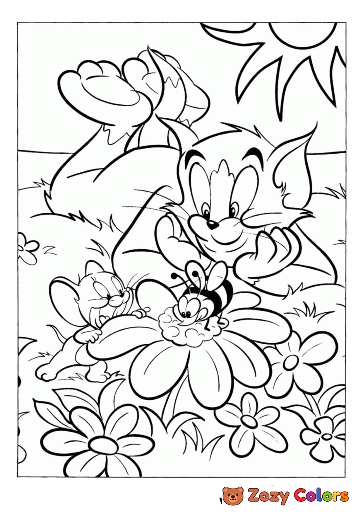 Tom and Jerry in nature looking at a bee. Coloring page to print or download and color.