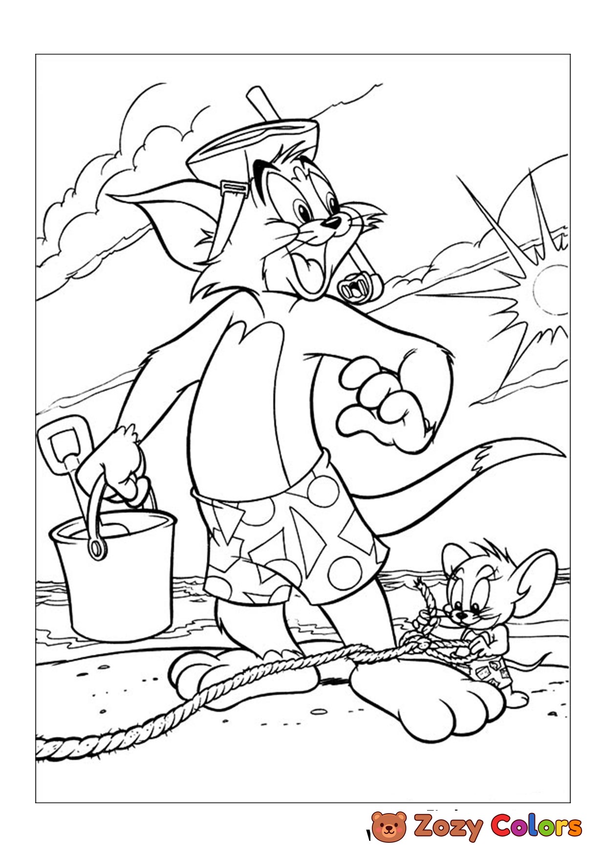 Tom and Jerry on the beach, Jerry pulling a prank on Tom. Coloring page to print or download and color.
