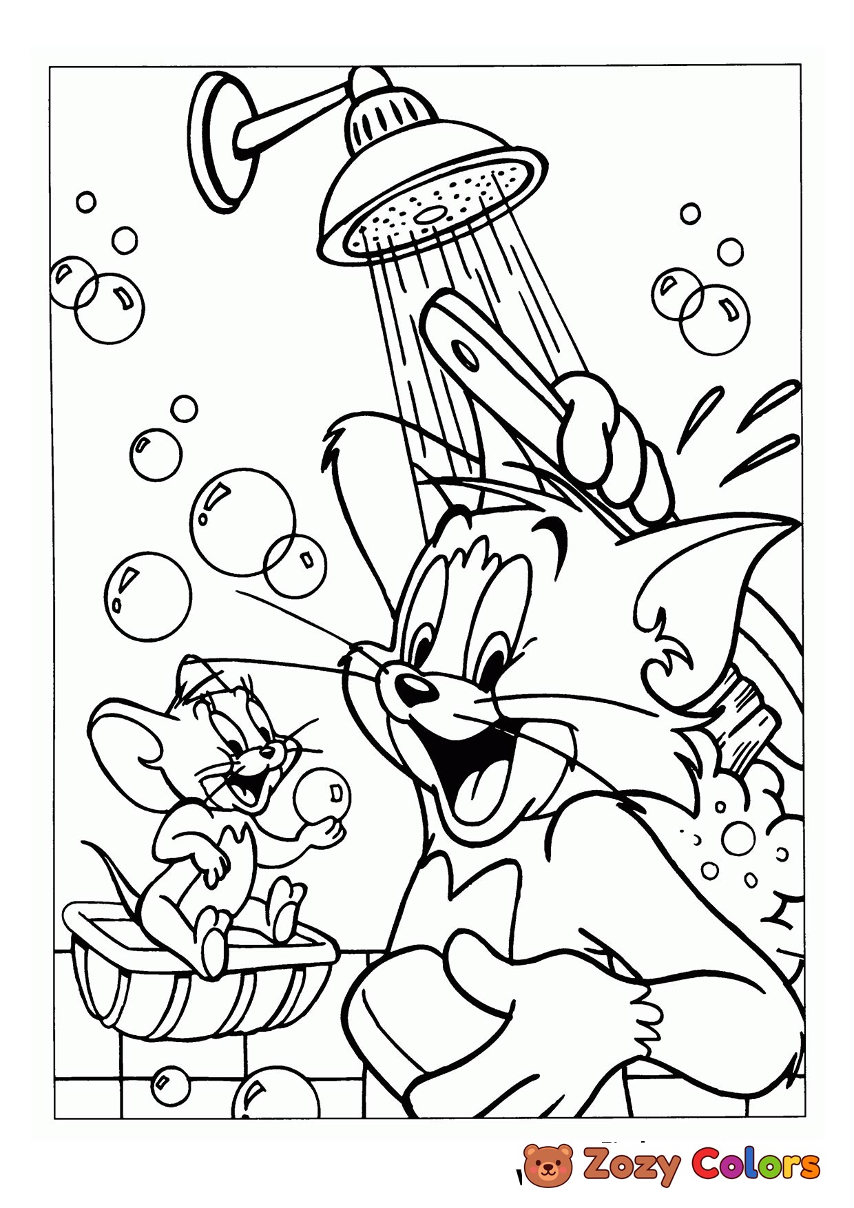 Tom and Jerry showering and cleaning themselfs with bubbles. Coloring page to print or download and color.