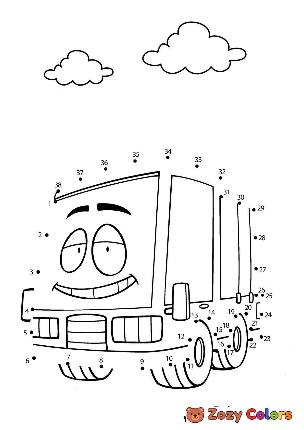 Truck - Free Dot the dots worksheets. Print, connect and color for kids.