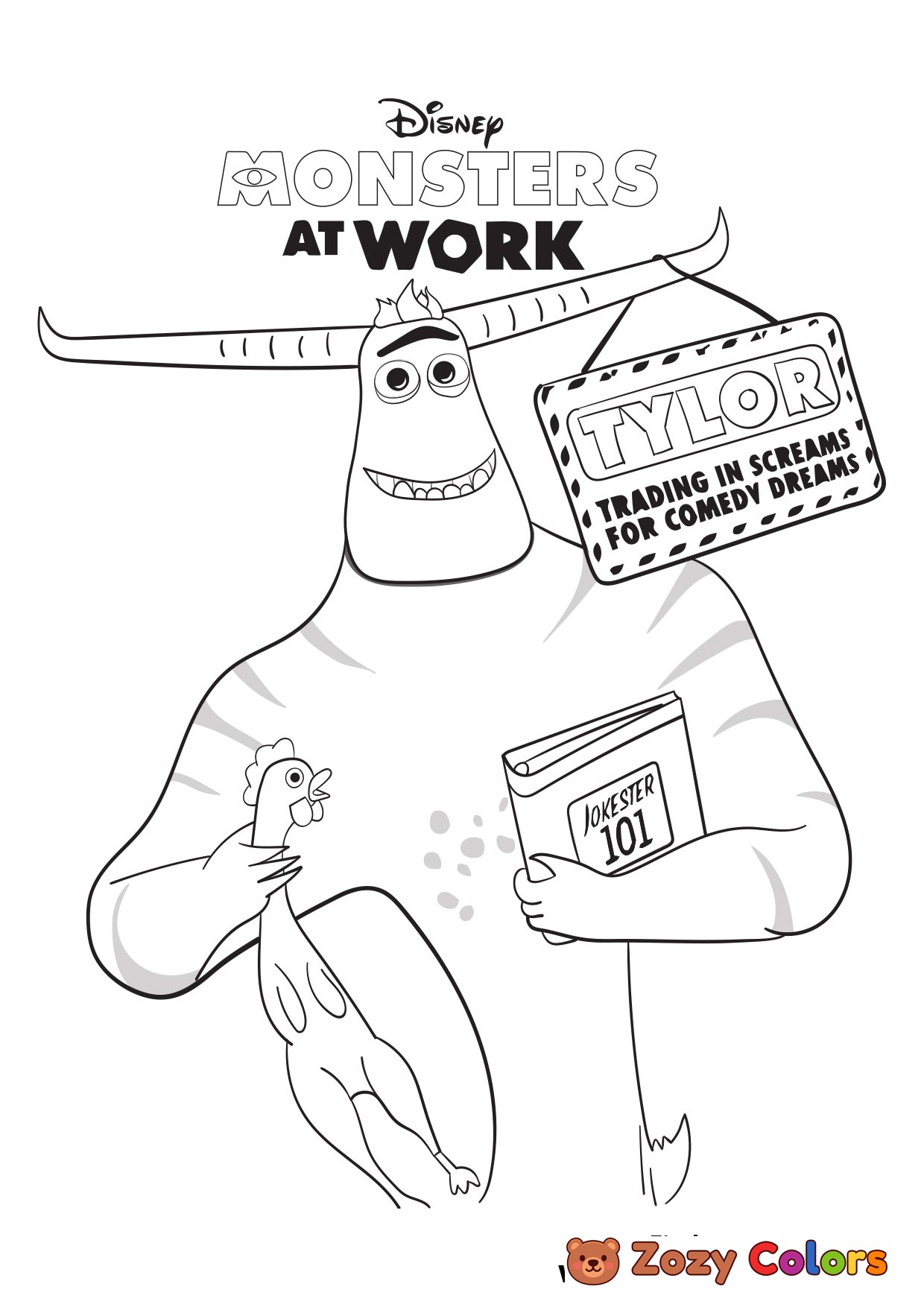 Tylor with a book - Monsters at work. Coloring page to print or download and color for your kids.