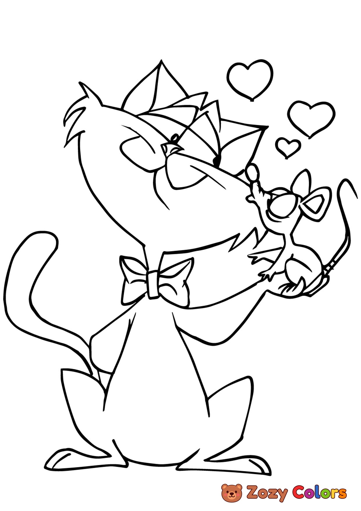 Valentines cat and mouse. Coloring page to print or download and color for your kids.