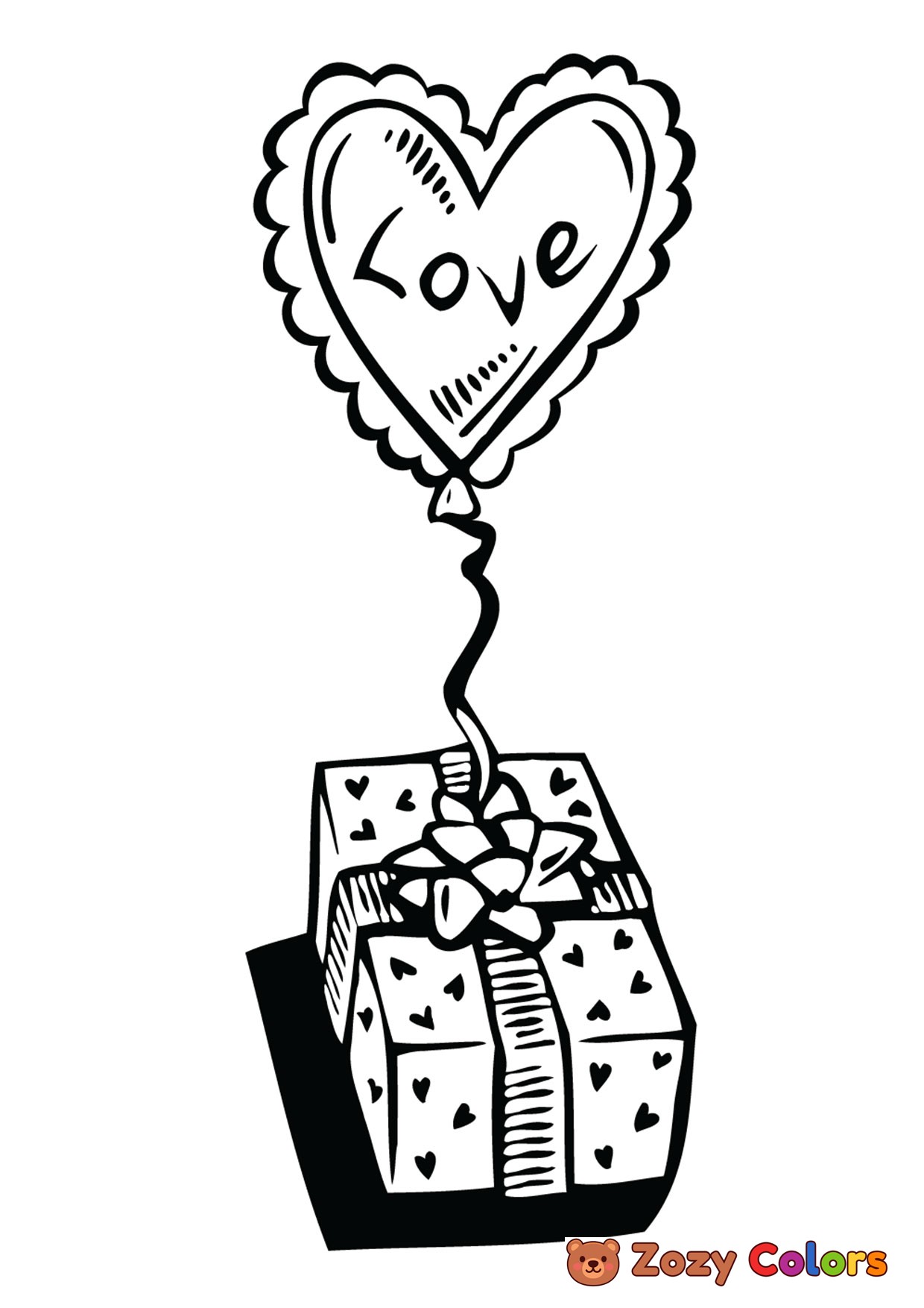 Valentines love present. Coloring page to print or download and color for your kids.
