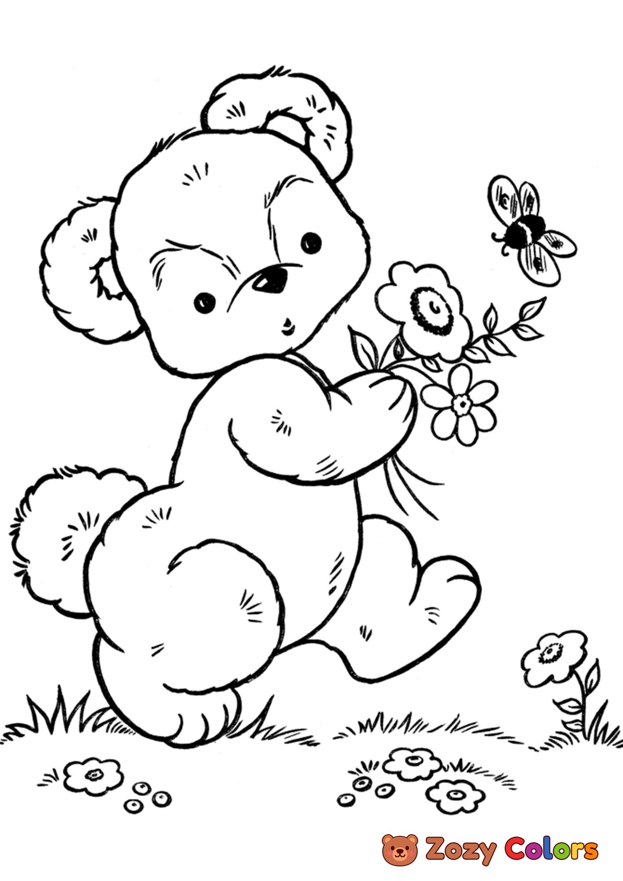 Valentines Teddy Bear with flowers. Coloring page to print or download and color for your kids.