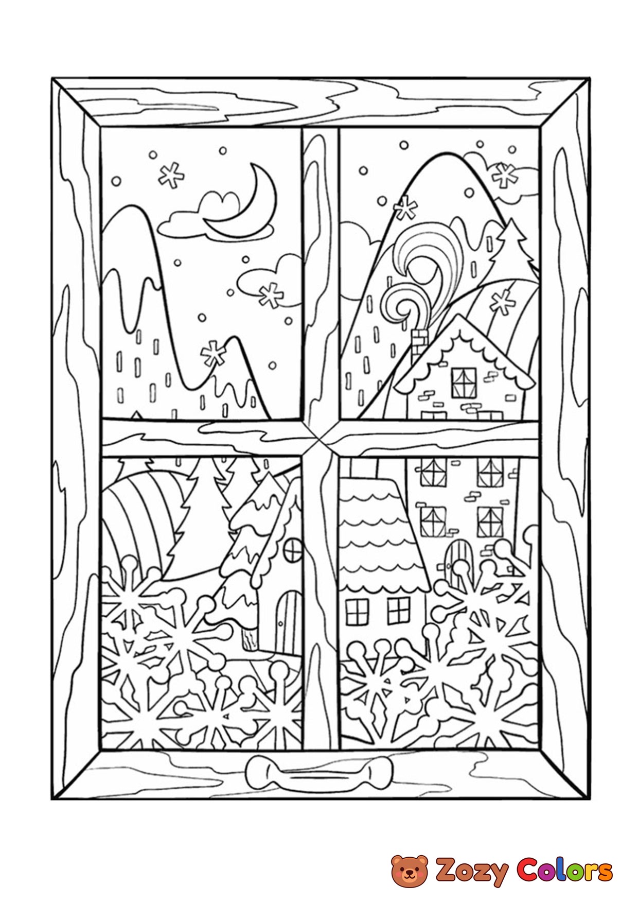 Winter theme window view. Coloring page to print or download and color for your kids.